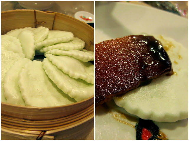 而隨乳豬附上的有2籠麵餅皮, 每片都帶點厚度, 但顏色居然是綠色的. 好奇一問侍應, 原來是內裡加入了綠茶, 難怪會顯得有點淺綠了. 不過其實入口完全沒有綠茶味, 而且感覺餅皮有點硬, 不太軟熟. 如果可以的話, 其實宅女寧願單吃乳豬皮算了, 反正那個皮肥脂不多, 基本上吃2片都不會好膩的.