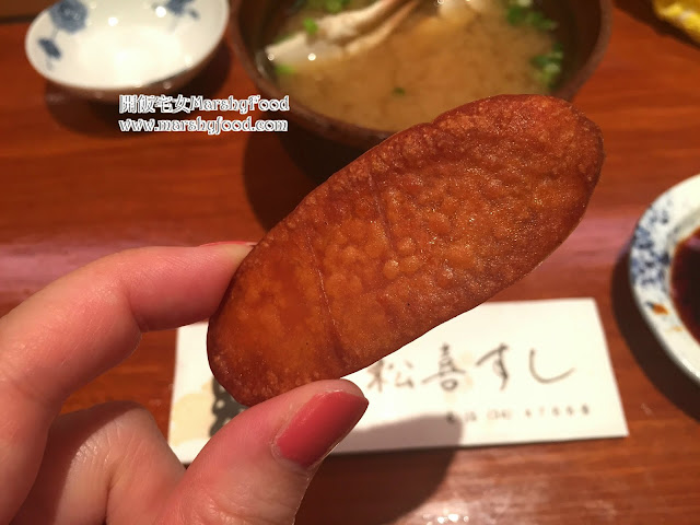 接下來壽司部份開始, 師傅先給我一塊這個, 宅女還未反應過來, 旁邊的大叔就對我說, 這個是烤魚肝來的. 咬下去有點硬, 內裡咸咸香香的, 如果不喝酒吃這個可能會有點乾, 但配著啤酒吃就剛剛好. 眼看左右兩邊的客人原來都有點這個來伴酒吃, 應該是個不錯的佐酒小吃吧.