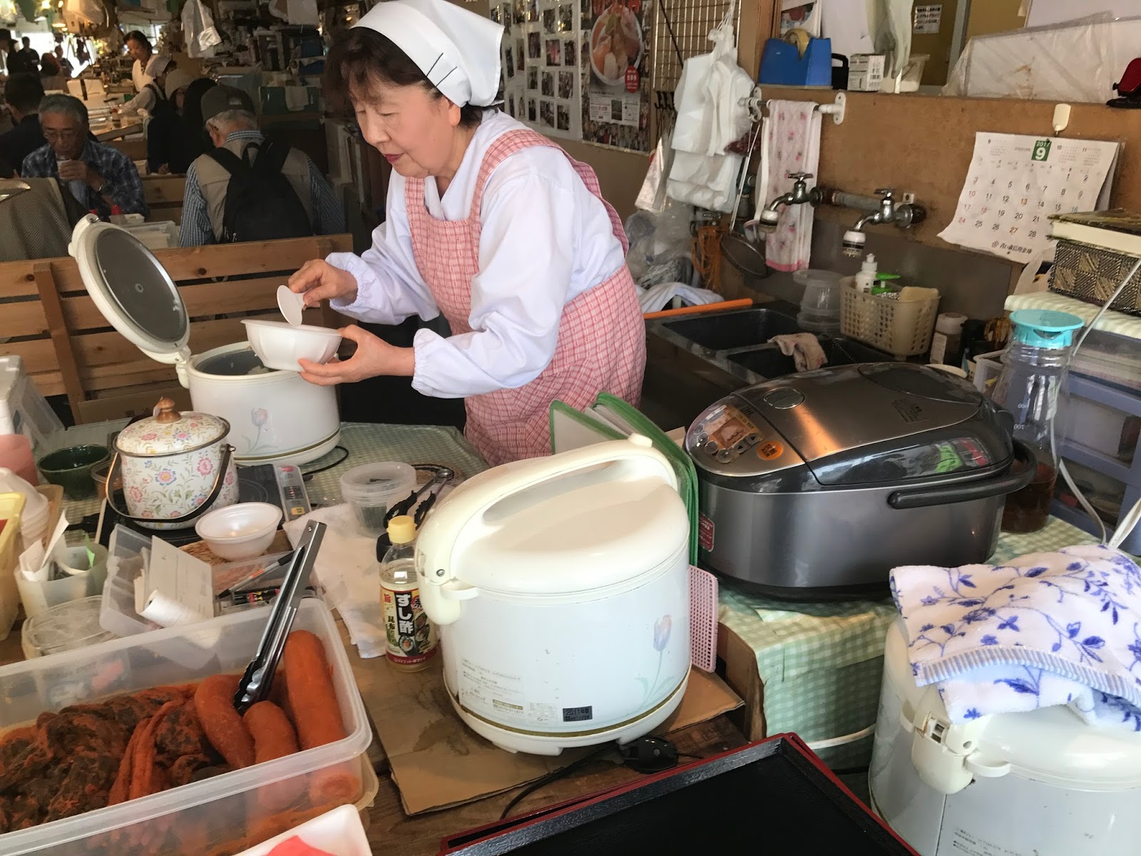 如果記不了地圖的位置也不用擔心, 市場內亦會有掛牌提示的. 拿著餐券, 第一件事當然要先拿個白飯啦, 沒飯怎麼做丼呢. 這時只要走到有這個紅牌子的地方, 就可以拿白飯了. 不過記著, 白飯也是要扣掉一張餐券啊~